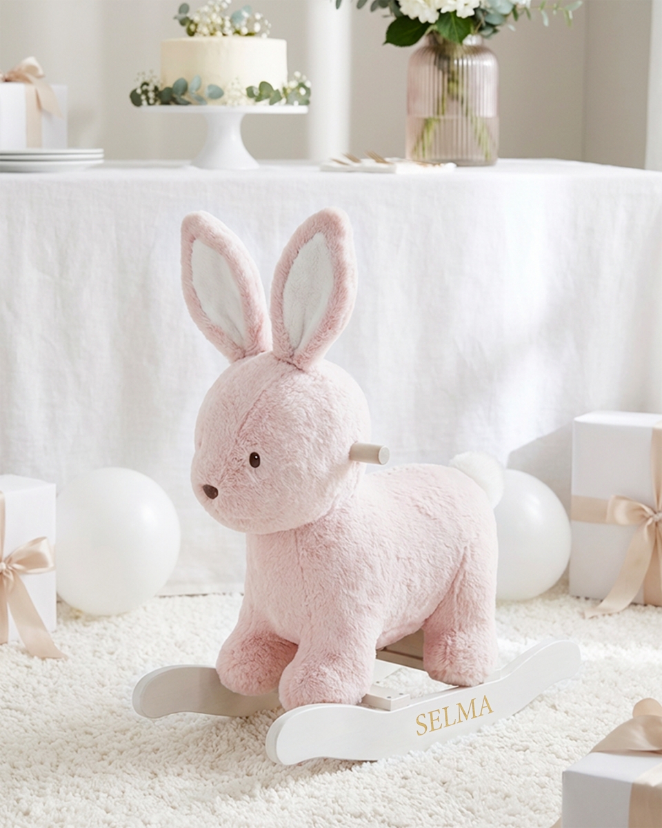 Det här roliga gungdjuret med personlig gravyr kommer att bli en självklar favorit hos de minsta. Den mjuka, rosa kaninen är mycket bekväm för barnet att gunga på, med handtagen och den breda sitsen kommer barnet sitta säkert. Se framemot många roliga lekstunder med den här fina kompisen.