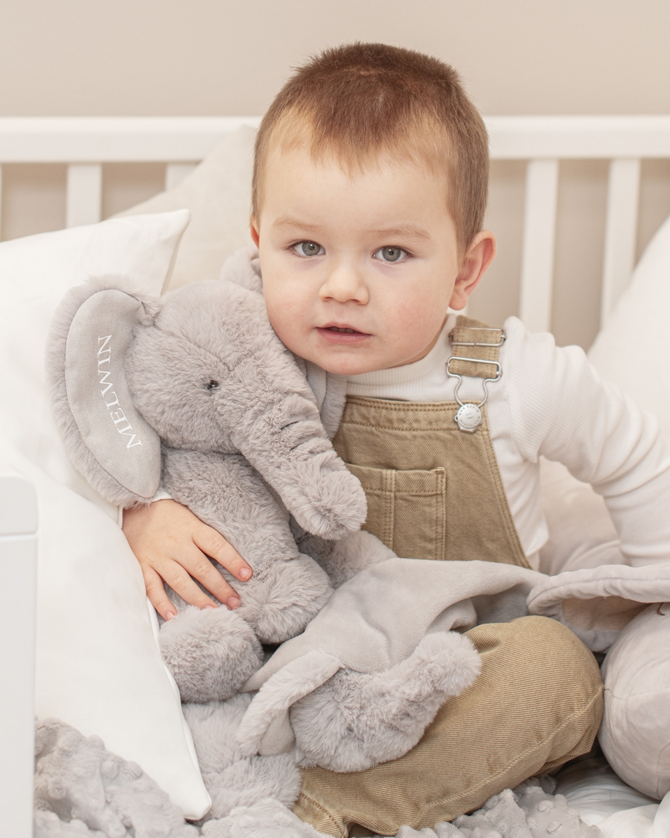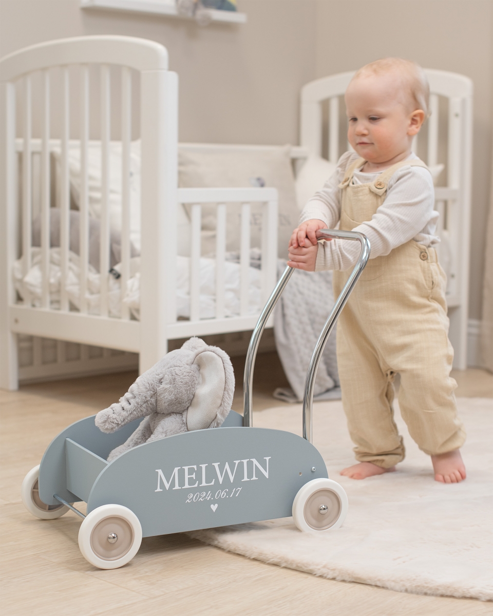 Det här personliga presentsetet är en underbar gåva till den lilla upptäckaren när det är dags för de första stegen! Setet innehåller en blå lära-gå-vagn, mjuk gosedjurselefant och fina träklossar i blå och grå toner – allt med barnets namn för en extra personlig touch!