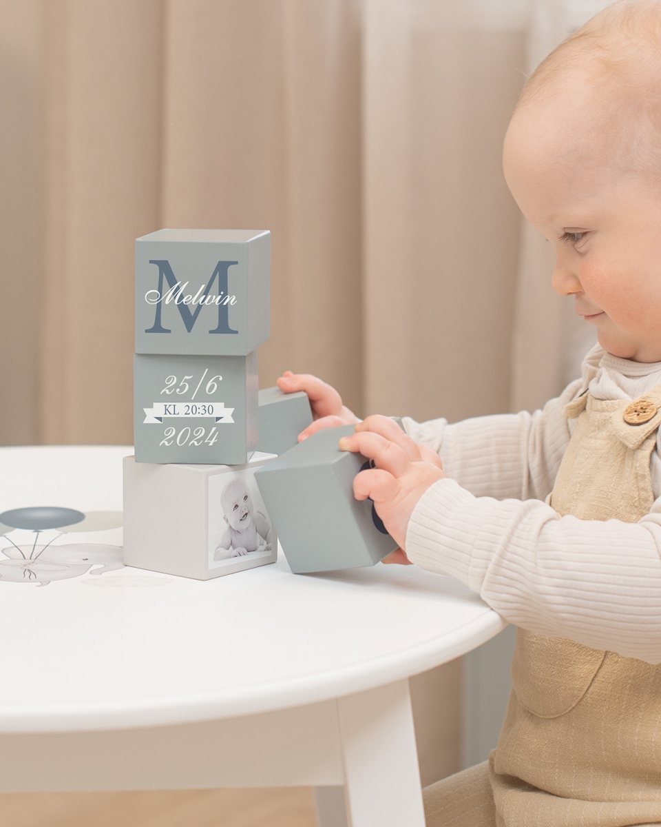 De dekorativa träklossarna i dova blå och grå nyanser bjuder in till kreativ lek. Med namn, födelsedatum och bild blir klossarna ett unikt minne som förevigar barnets första tid.