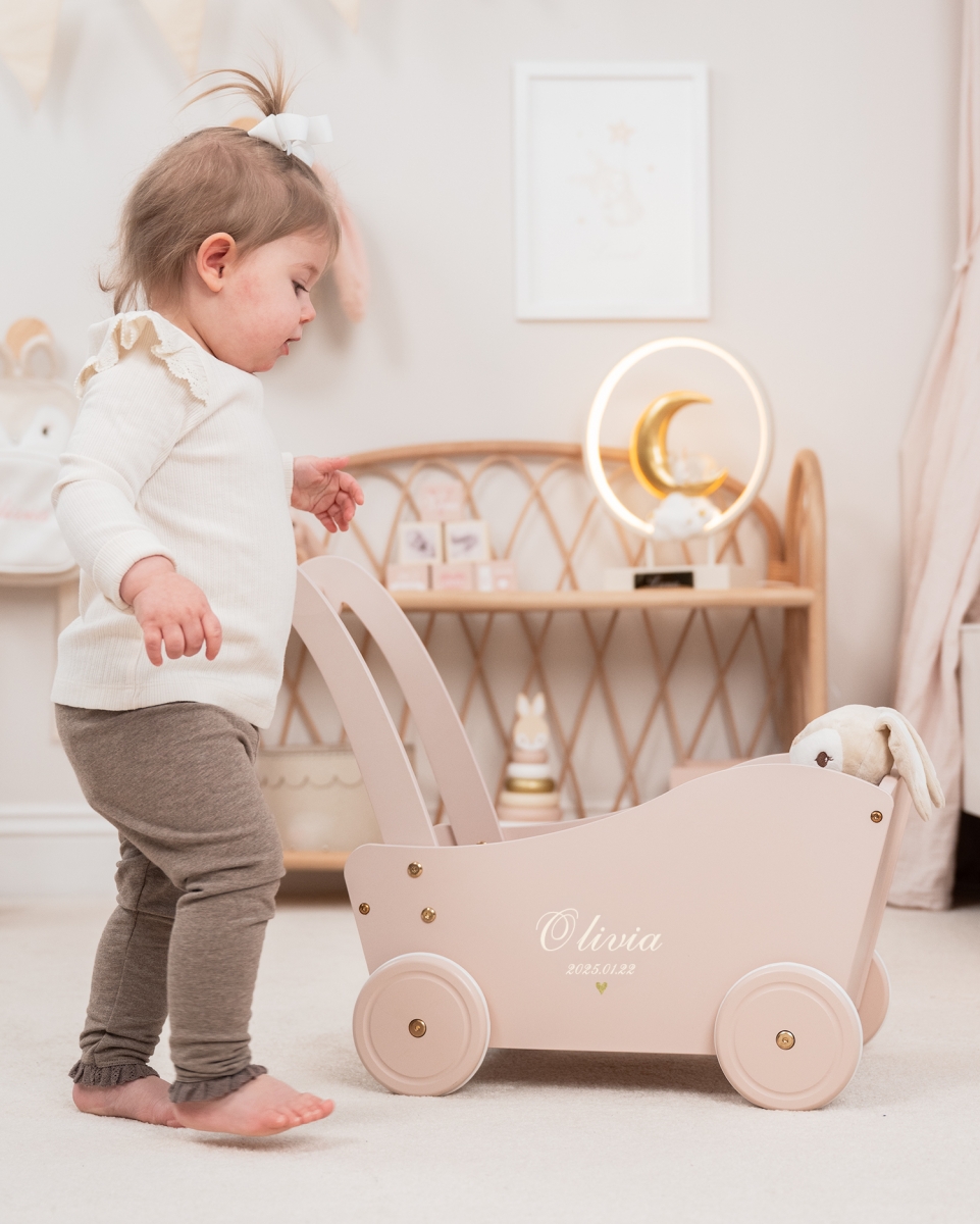 En klassisk dockvagn i rosa för kreativa och lekfulla stunder. Gör din dockvagn extra speciell med en personlig märkning av ditt barns namn. Namnet printas med namn och datum i vitt med ett hjärta i guld. Detta gör dockvagnen både unik och personlig.
