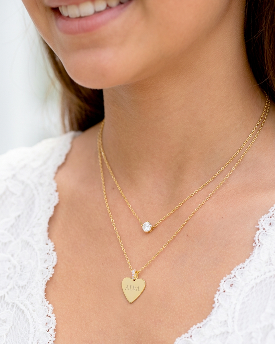 Det ena halsbandet har ett guldhjärta med gnistrande strasstenar, där valfritt namn eller initialer graveras för en personlig touch. Det andra halsbandet pryds av en skimrande kubisk zirkonia-sten som reflekterar ljuset och ger en vacker lyster.