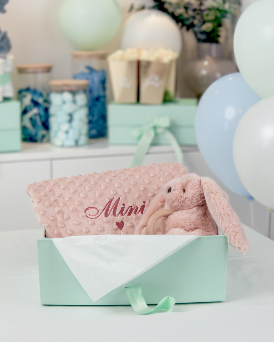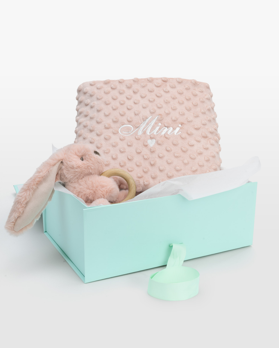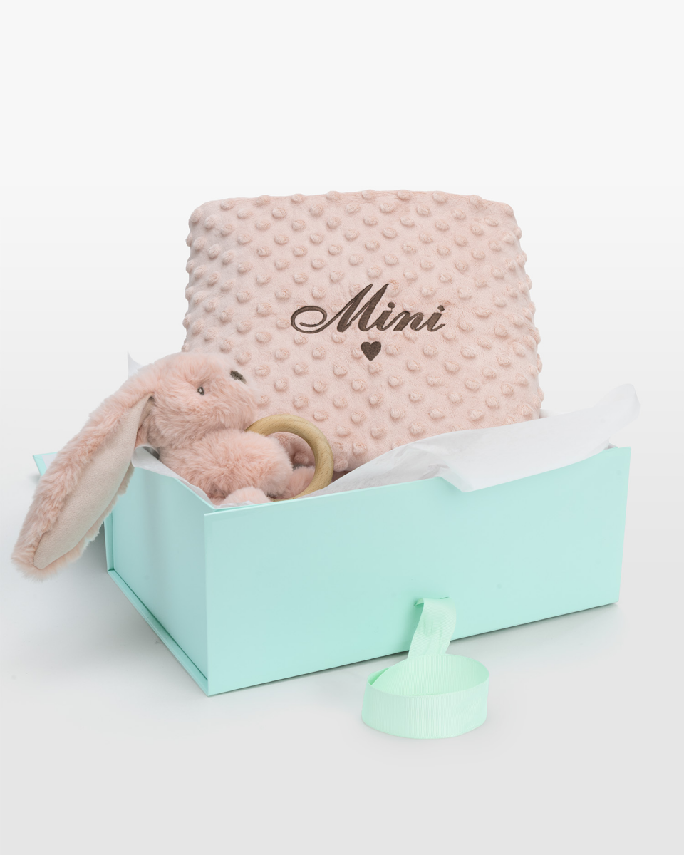 Gosedjur med bitring i trä & Babyfilt med namn, rosa - Babyshower