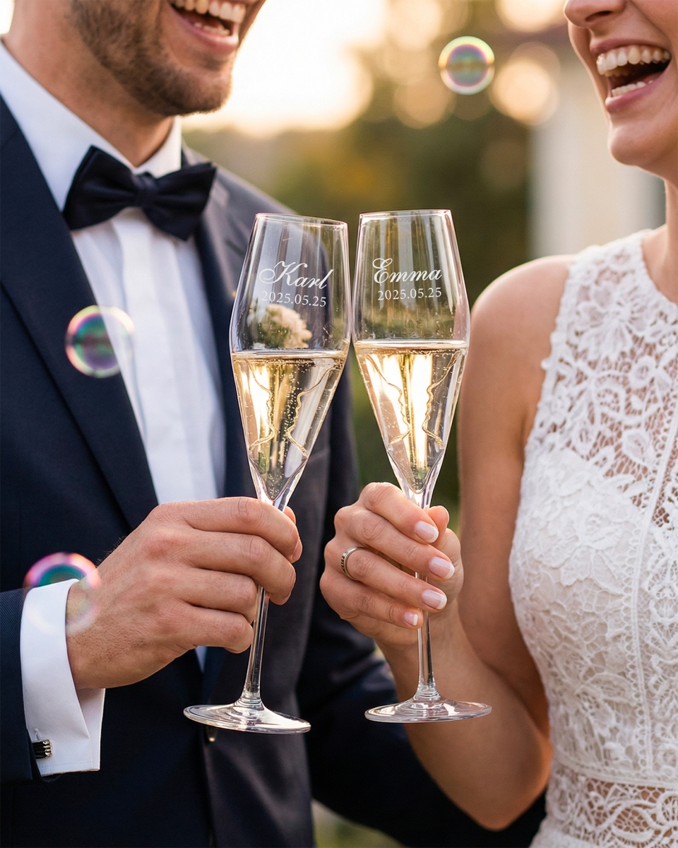 Det som verkligen gör dessa glas speciella är den vackra detaljen – i varje glas syns silhuetterna av två ansikten, som symboliserar paret och deras förening. Denna unika gravyr ger ett extra lager av betydelse och minne till varje skål. Silhuetterna tillsammans med den personliga gravyren ger champagneglasen ett genomarbetat och lyxigt utseende.