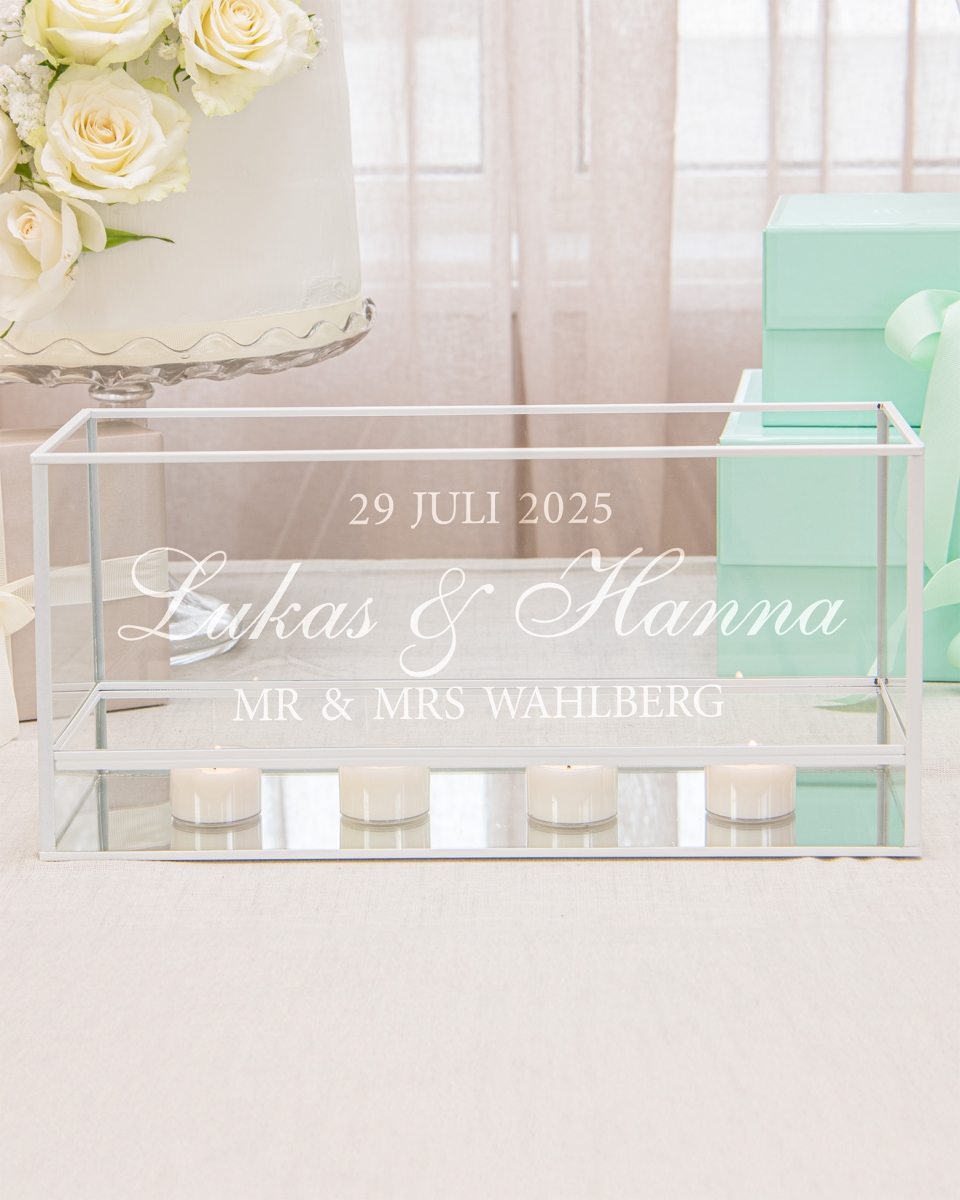 Ge brudparet en unik och minnesvärd gåva med denna stiliga, vita ljuslåda i glas, graverad med deras namn och vigseldatum.