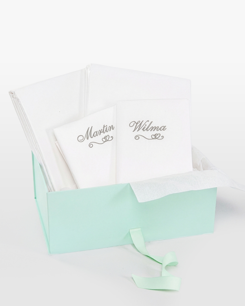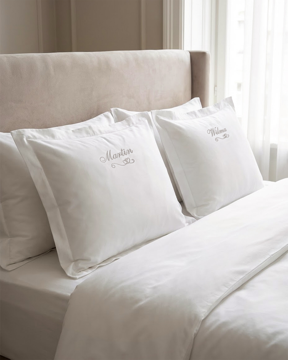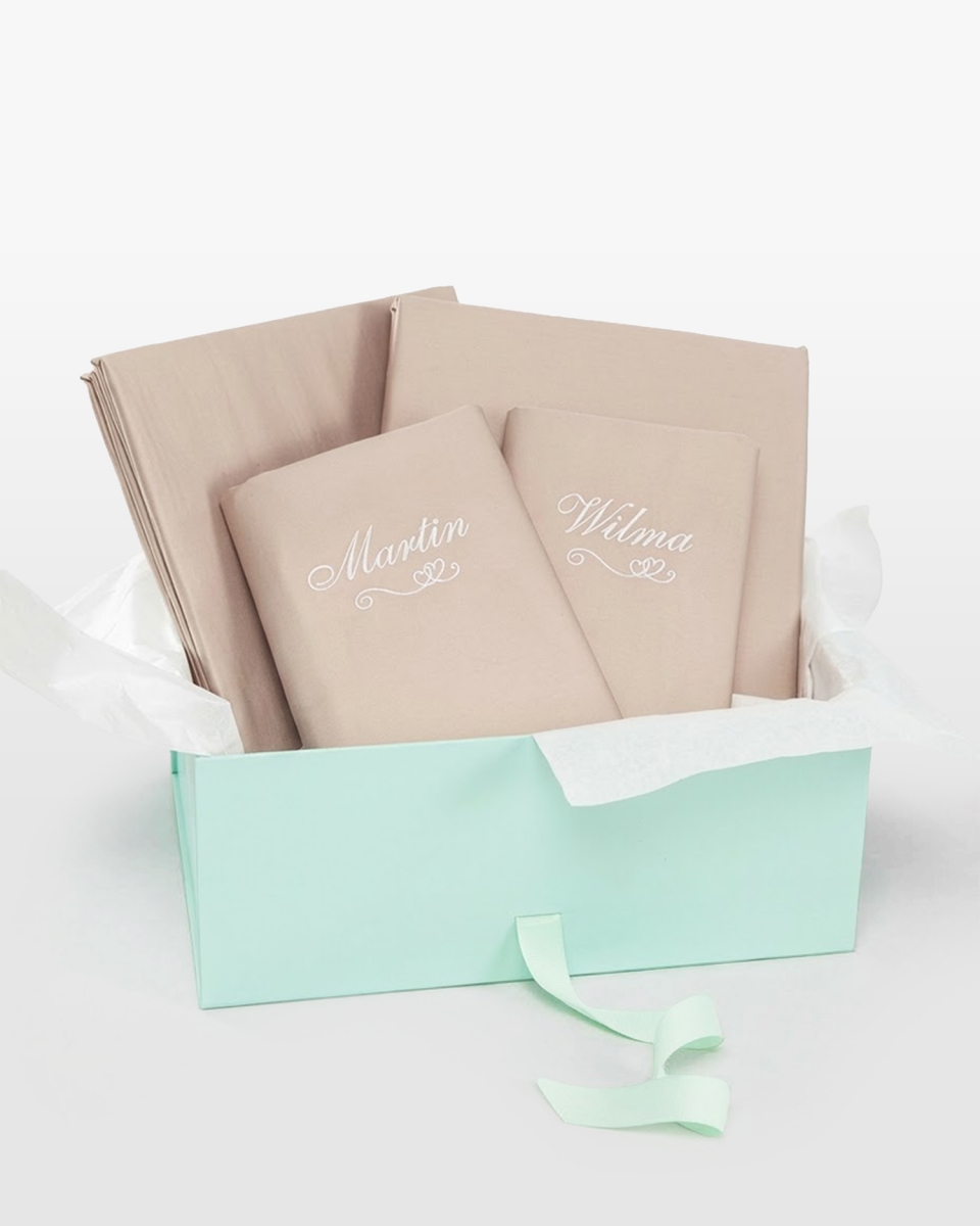 Ge brudparet en lyxig natts sömn med vårt 2-pack påslakanset och underlakan i mjuk lyocell. Med en stilren design och personlig brodyr kommer sängkläderna att ge en elegant touch till sovrummet.