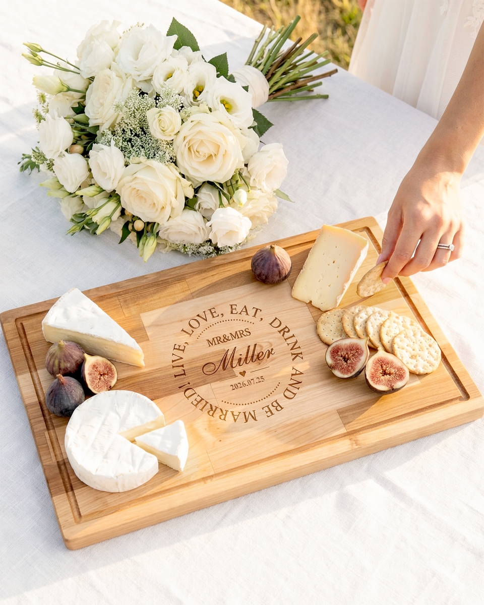 Ge bort en minnesvärd och praktisk present till det nygifta paret - en vacker skärbräda i al eller valnöt med titel (tex. Mr & Mrs), namn och datum graverat. Denna stilrena bräda fungerar inte bara som en funktionell skärbräda, utan även som en elegant serveringsbräda eller dekorativt inslag i köket.