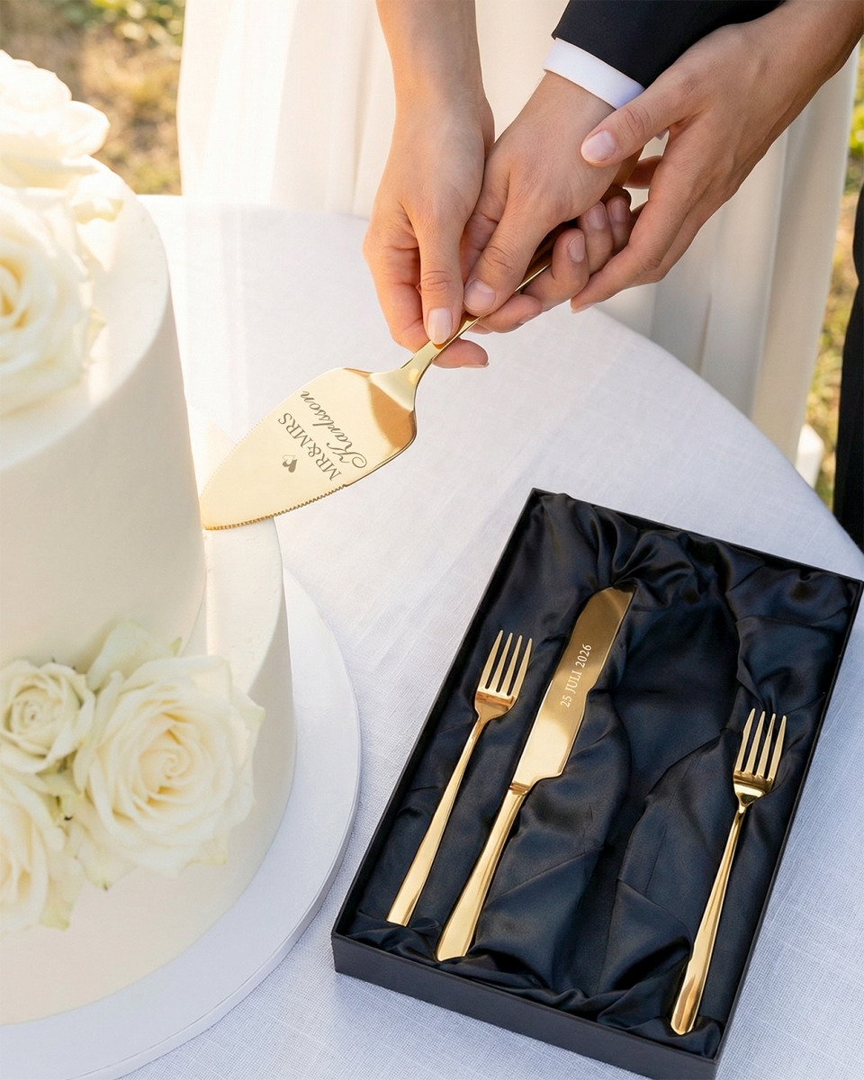 För att göra gåvan extra unik graveras tårtspaden med "Mr & Mrs" samt parets efternamn, och tårtkniven med bröllopsdatumet. Varje gång paret använder besticken, oavsett om det är vid årsdagar eller andra festliga tillfällen, kommer de att påminnas om sin stora dag och den kärlek de delar.