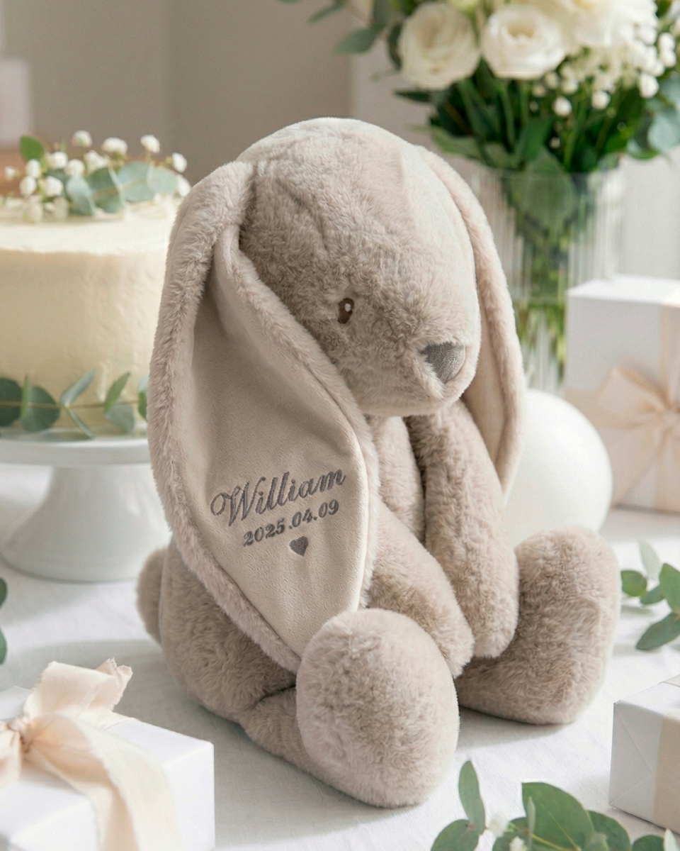 Ett stort gosedjur för extra varma och stora kramar. Gosedjurskaninen, som broderas med barnets namn i örat, kommer att bli en speciell och unik vän att skapa varma minnen med.