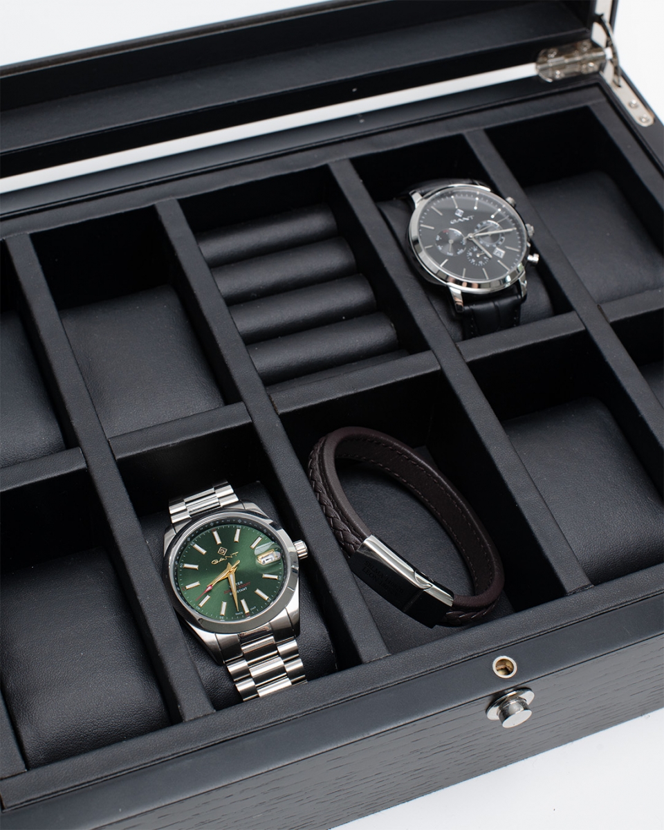 En exklusiv klocklåda i generös storlek med plats för upp till åtta klockor – perfekt för den som vill samla och förvara sina favoriter med stil. Invändigt finns även praktiska fack för exempelvis manchettknappar och andra mindre accessoarer, vilket gör lådan både funktionell och genomtänkt.
