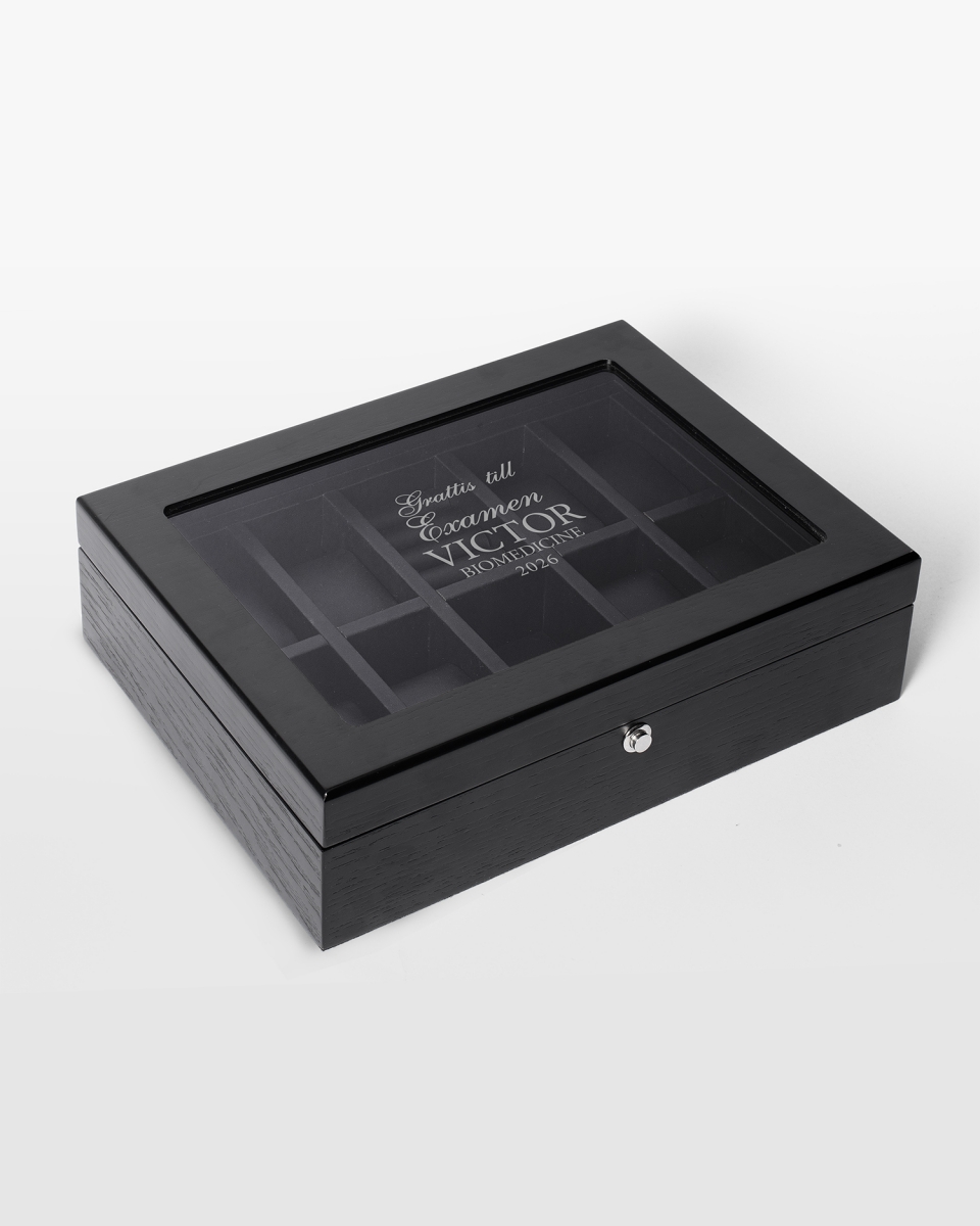 Lådan är tillverkad i trä och har ett elegant glaslock som kommer personligt graverad med exempelvis en grattishälsning, namn och utbildning – en detalj som förvandlar förvaringen till en minnesvärd examenspresent. Den personliga gravyren gör varje exemplar unikt och skapar ett bestående minne av en viktig milstolpe.