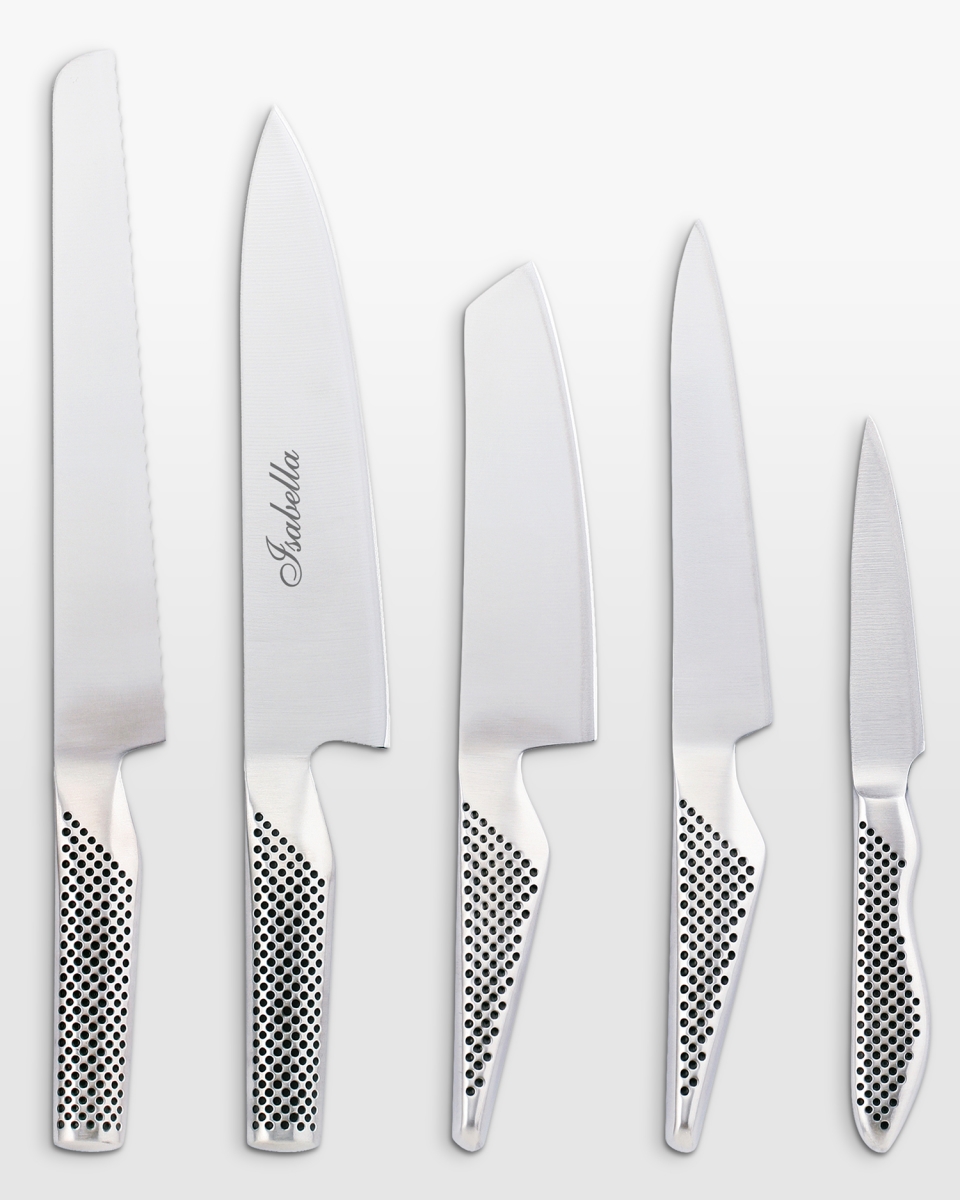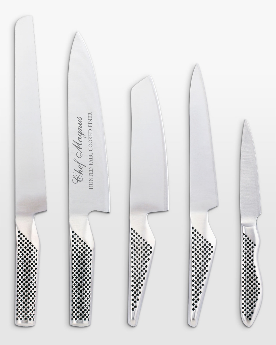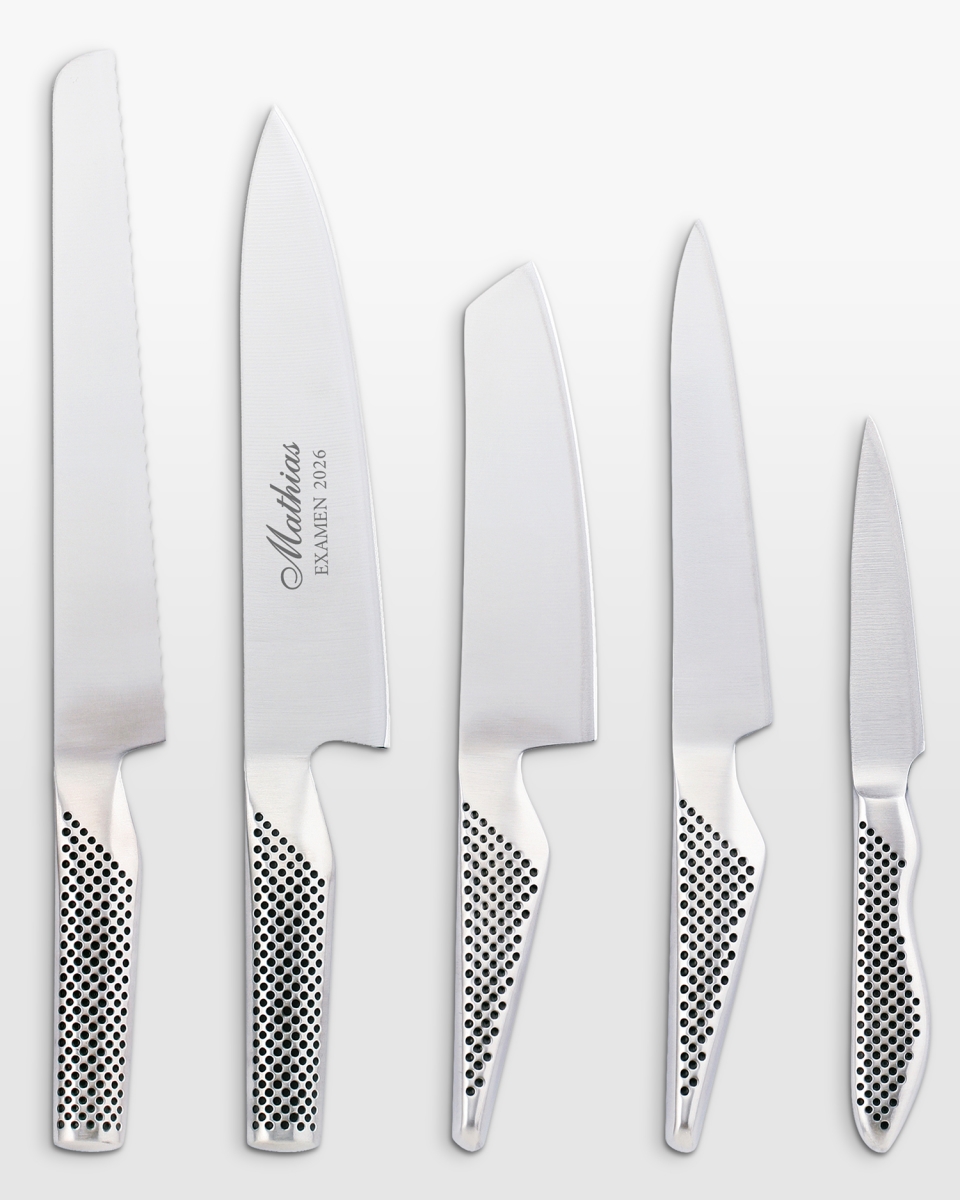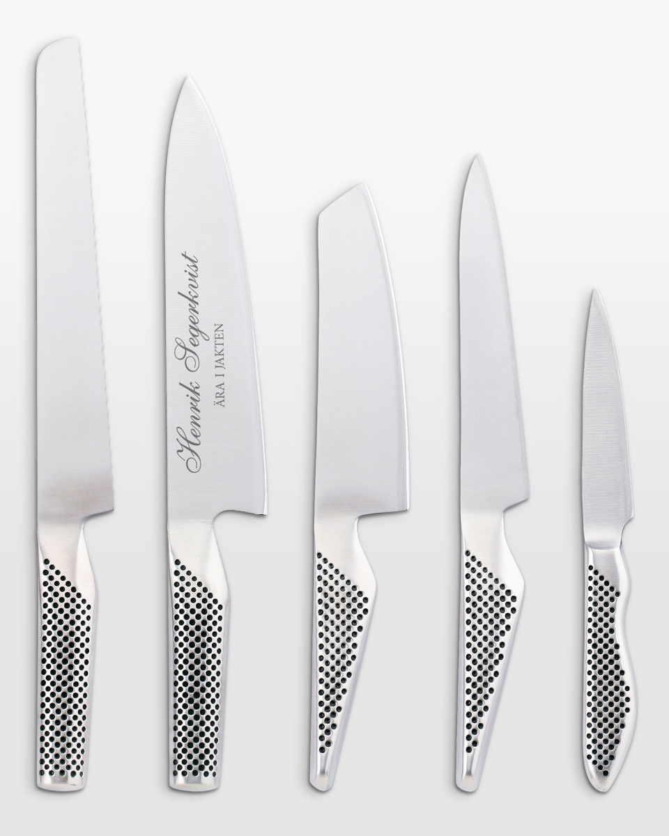 Letar du efter en exklusiv och personlig present till någon som älskar att laga mat? Då är detta 5-delars knivset från Global med personlig gravyr ett självklart val. Med fem noggrant utvalda knivar ur Globals klassiska serie täcker du alla behov i köket – från frasigt surdegsbröd till precisionsjobb med frukt och grönt.