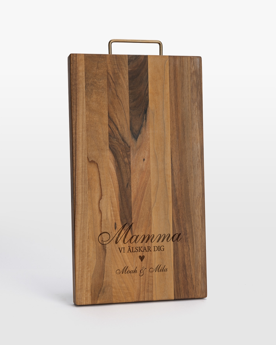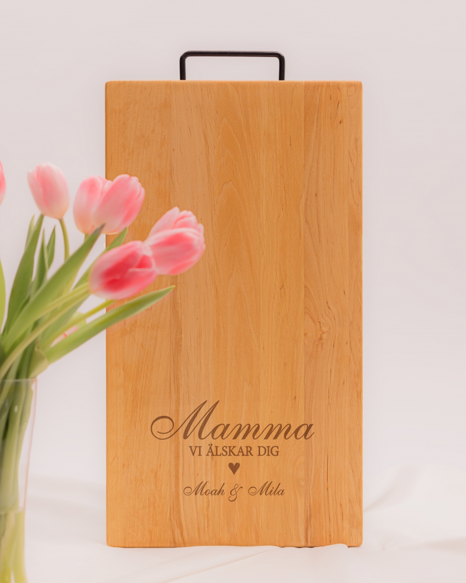 Skärbräda med personlig gravyr. Den här robusta skärbrädan med handtag är perfekt för att förbereda maten på, eller för att använda som serveringsbräda och duka upp kvällens charkbricka. Med den rörande gravyren blir skärbrädan en påminnelse till mamma om hur älskad hon är. Den här presenten till mamma är både unik och lyxig, och kommer garanterat bli en stor hit hos mamma.