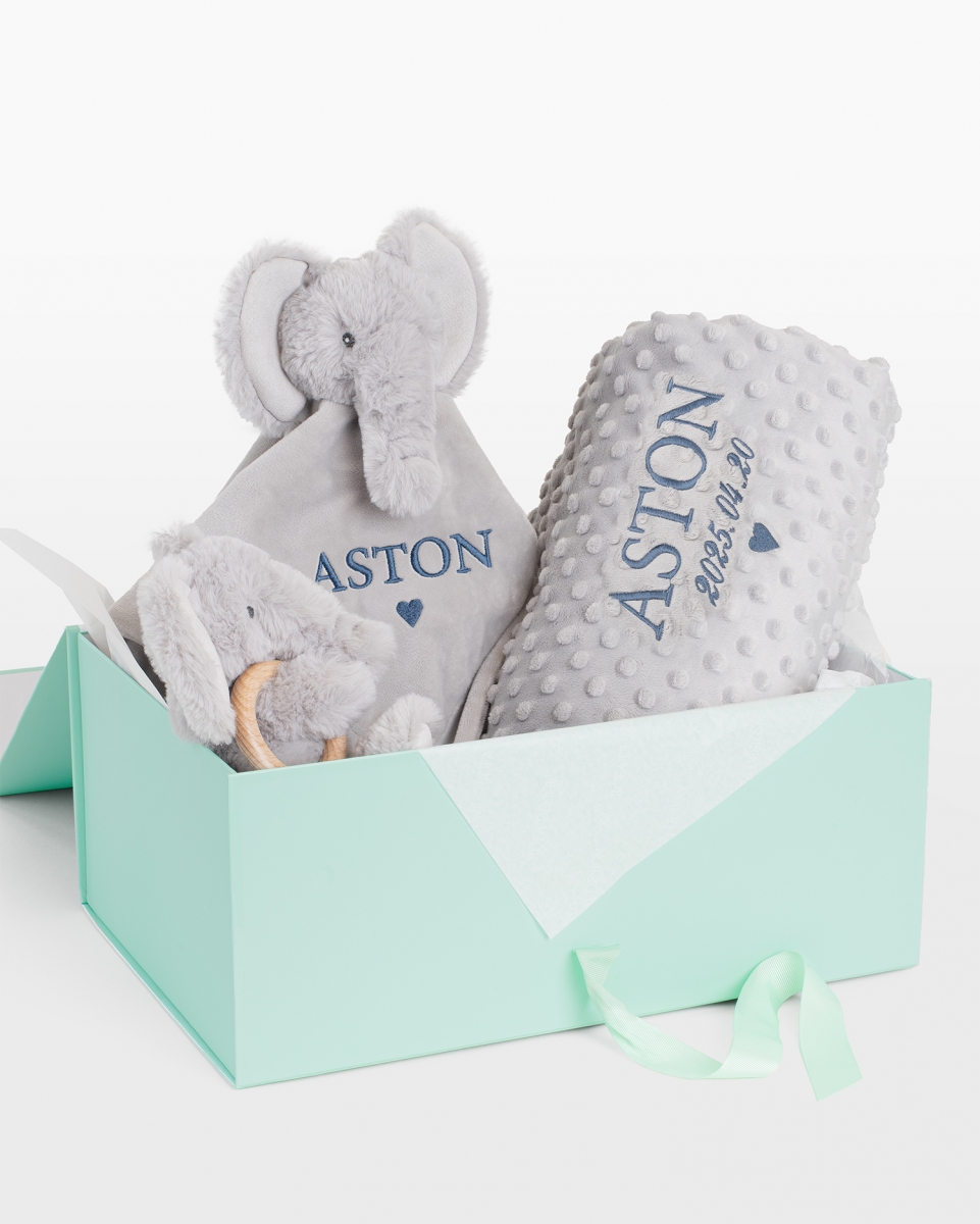 Snuttefilt, Gosedjur med bitring & Babyfilt med namn, grå - Elefant