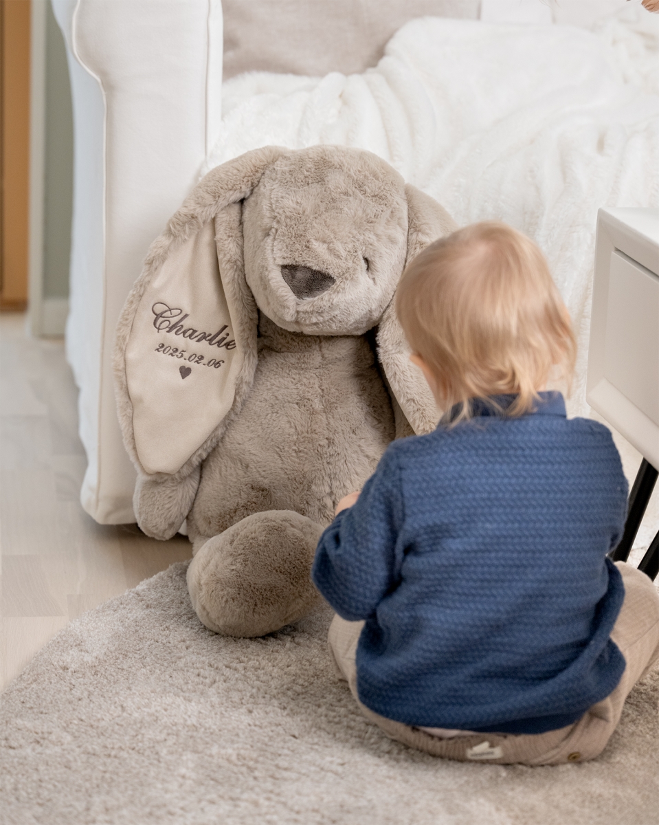 Ett stort gosedjur för extra varma och stora kramar. Gosedjurskaninen, som broderas med barnets namn i örat, kommer att bli en speciell och unik vän att skapa varma minnen med.