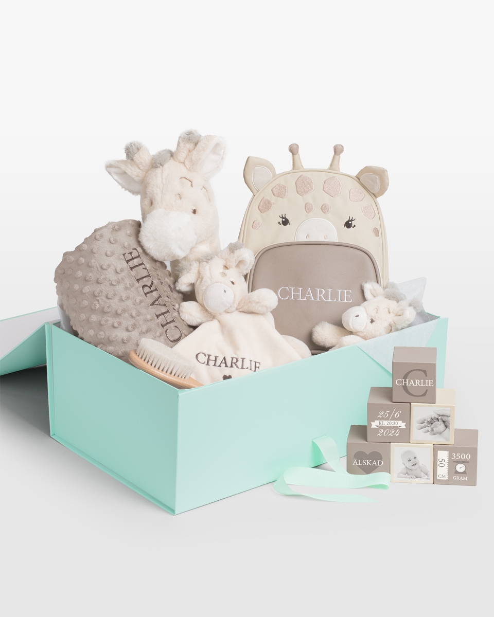 I detta exklusiva set ingår allt från ett gosigt giraffgosedjur och en snuttefilt broderad med barnets namn, till en liten skallrande minigiraff som snabbt blir en favorit. Den varma babyfilten, med både namn och födelsedatum broderat, skapar trygghet från första stund. Dessutom medföljer en barnryggsäck med namn, vackra träklossar för lek och dekoration samt en mjuk babyborste efter dem mysiga badstunderna.