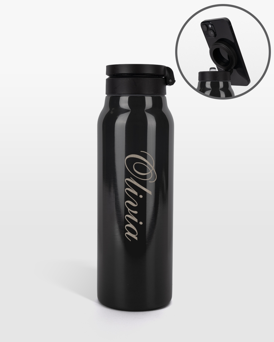 Vattenflaska med namn och magnetisk mobilhållare, svart - Script
