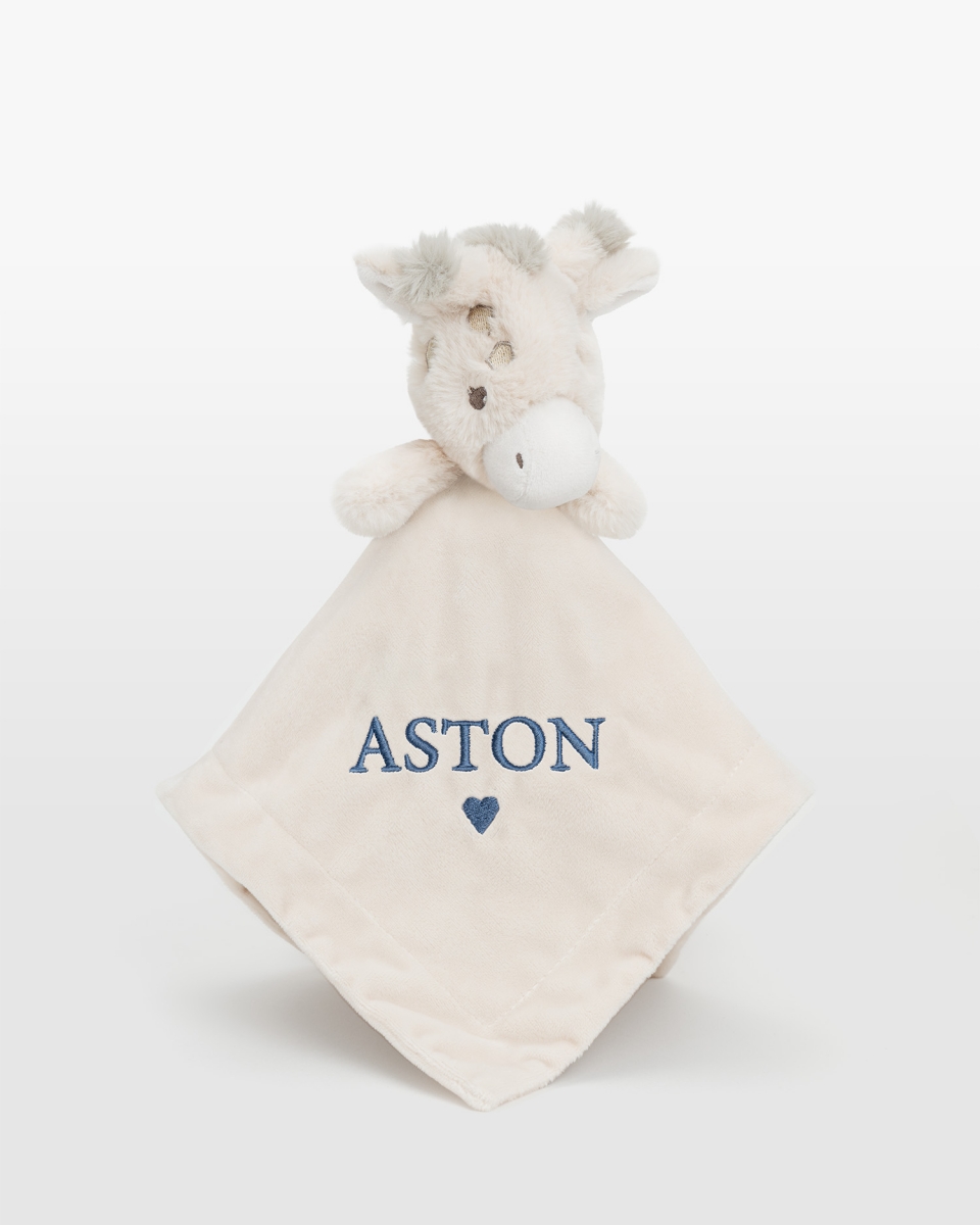 En mjuk snuttefilt i cremefärg med motivet av en giraff – den perfekta trösten för ditt barn! Den mjuka snuttefilten är lätt för små händer att hålla i och blir snabbt en kär vän att ta med överallt. Med barnets namn broderat på snuttefilten blir den en personlig present.