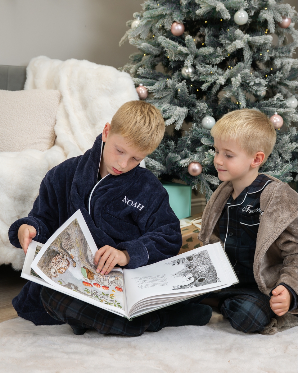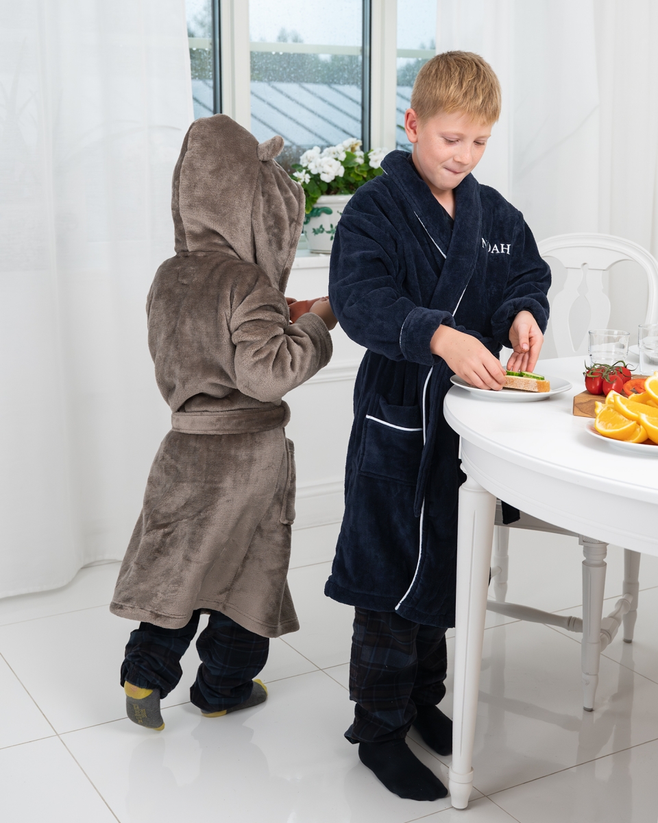 Låt barnet svepas in i mjukhet och gos efter badet eller under morgonstunden med en marinblå barnbadrock med namn.